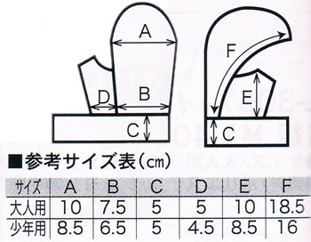 サイズ:少年用(A 8.5cm、B 6.5cm、C 5cm、D 4.5cm、E 8.5cm、F 16cm)